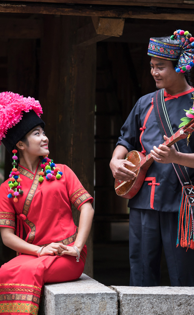云南壯族主要聚居在文山州,人口114萬,民間的村寨大多依山傍水。壯族擅長種植水稻,有太陽崇拜和長老崇拜的風俗,視銅鼓為重器,厚愛銀飾,善烹制五色花米飯,能歌善舞,熱情好客。進入景區(qū)壯族村,迎面有祭祀龍王的龍柱,兩邊是先民繪制的天王崖畫和為紀念傳說洪水泛濫時幫助先民度過劫難而建的石葫蘆亭。祭祀玉皇大帝的昊天閣和傳說能驅(qū)邪納福的碩大銅鼓聳立在廣場兩側。桿欄式和麻欄式民居、壯族青年社交休憩的“情廊”、村...